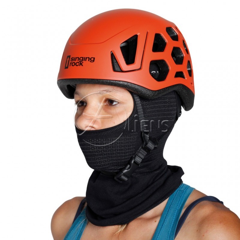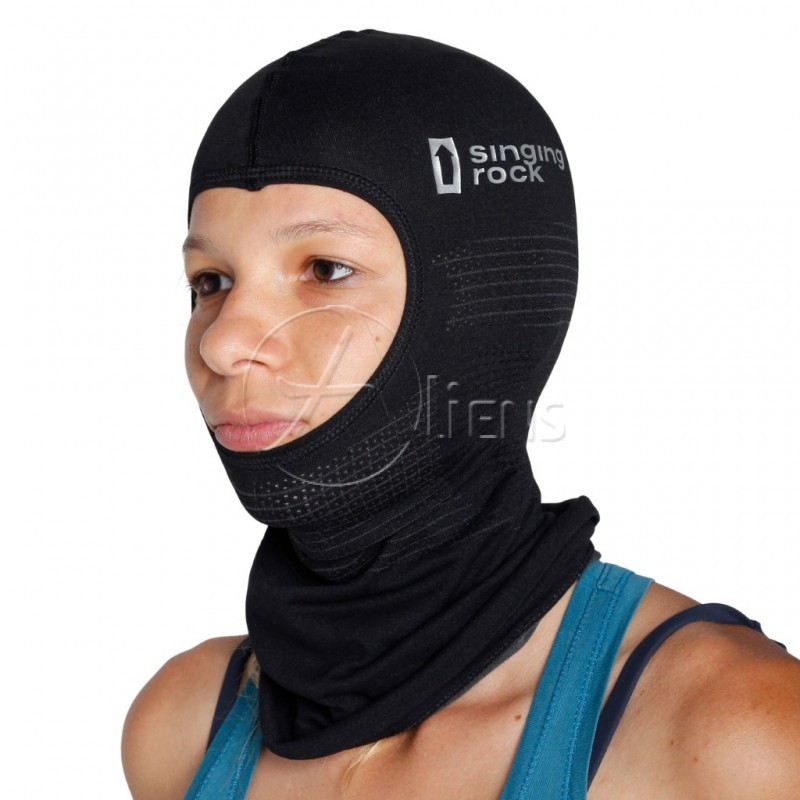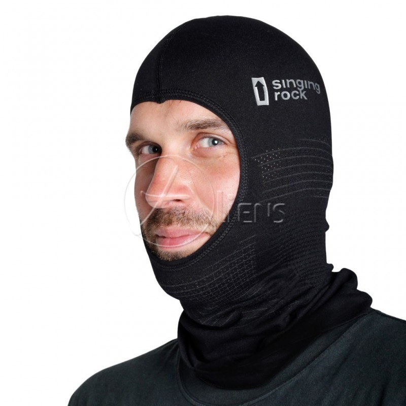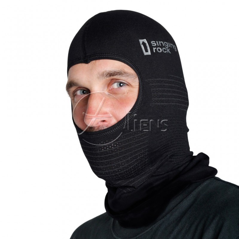 Entwickelt für das Tragen unter einem Helm bei allen vertikalen Aktivitäten. Sie können es als Balaclava, Halb-Skimaske oder Halstuch tragen. Trage sie nur nicht am Flughafen oder in der Bank!